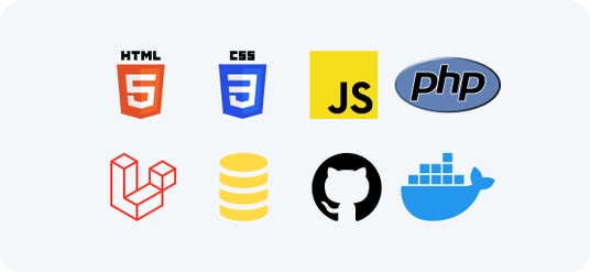 HTML、CSS、JavaScript(DOM)、PHP、Laravel、SQL、GitHub、Docker など