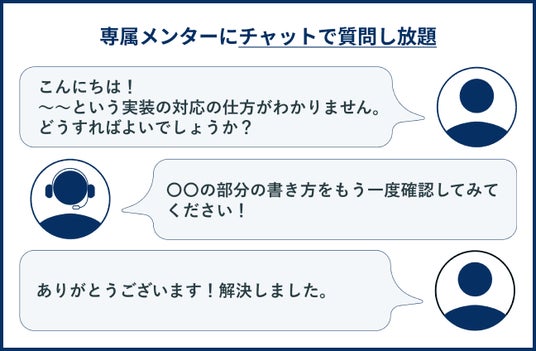 専属の現役エンジニアにいつでも質問し放題専属メンターの現役エンジニアに対して、回数無制限・いつでも質問し放題です。