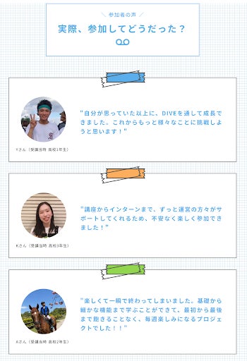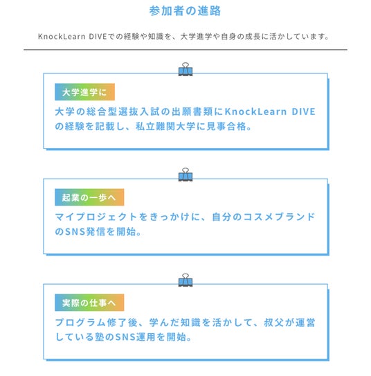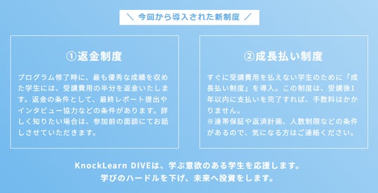 今年の夏以降新たなチャレンジをしたいと考えている方に向けて、より多くの高校生に「KnockLearn DIVE」を体験していただけるよう、今年の夏限定で受講料を3万円から2万円に値下げいたしました。