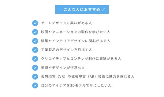 ゲームデザイン、映画・アニメーション制作、製品設計、建築ビジュアライゼーションなど、将来的に3Dモデリングスキルが求められる分野で活躍を目指します。