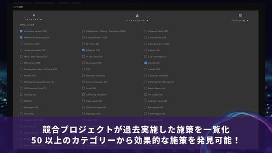 また、マーケティングエクスプローラー画面では、特定の施策カテゴリーやプロジェクトジャンルなどからプロジェクトを検索することも可能となっており、これから実施する施策群の参考となるデータをスムーズに取得することも可能です。