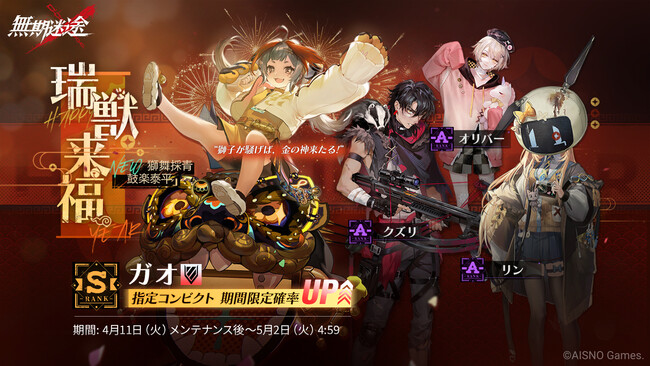 逮捕詳細:期間中、イベントで新登場するS級コンビクト「ガオ」、A級コンビクト「リン」を獲得できます。また、S級コンビクト「ガオ」、A級コンビクト「リン」「クズリ」「オリバー」の獲得確率がUPします!