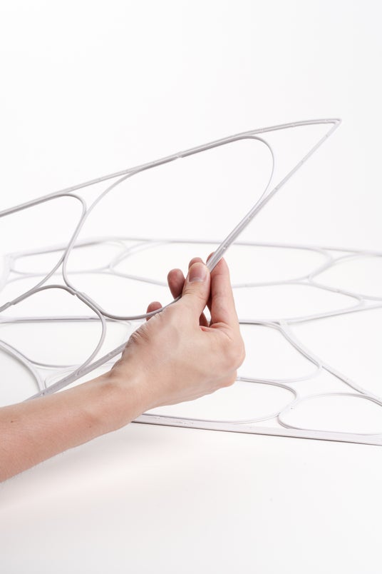 リーフ型のオブジェには、植物由来素材「kinari」を採用。軽やかなメッシュ構造が粉砕・再資源化のしやすさを持ちながらも、造形の複雑さや美しさを両立。3Dプリントならではの「構造そのものが機能を持つ」設計力が、従来の工法では難しかった表現を可能にしています。