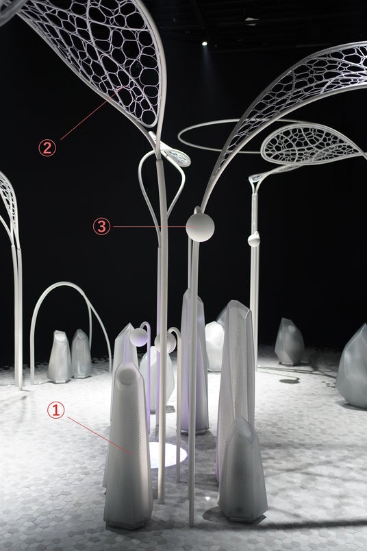 「ノモの森」には、形もサイズも異なる13種類・約40点のオブジェが配置されています。歩みを進めるたびに景色が移り変わり、まるで本物の森の中を探検するような感覚を来場者にもたらします。どのオブジェも、無限のバリエーションを生み出すパラメトリックデザインで設計され、一つひとつが3Dプリントによる個別製造で実現しました。