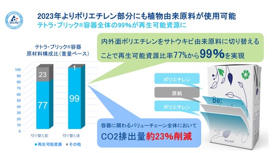 子供たちが飲みやすく、衛生的な「テトラ・ブリック(R)容器」のコーティングにサトウキビ由来の植物由来ポリエチレンを使用したことにより、再生可能資源比率を77%から99%まで高め、容器に関わるバリューチェーン全体において約23%(※1)のCO2排出量削減を実現します。