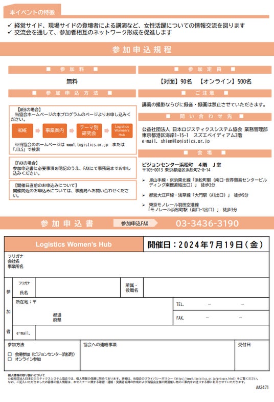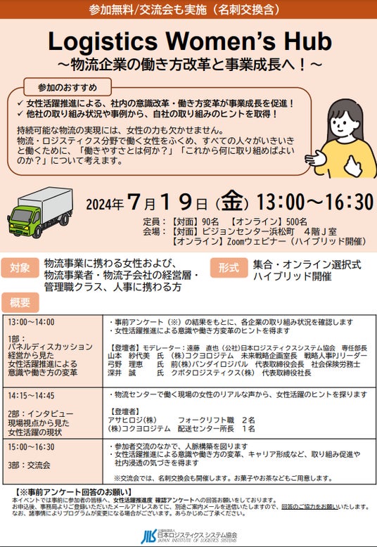 株式会社コクヨロジテム(本社:大阪府/代表取締役:松浦鉄男)は、コクヨロジテム未来戦略企画室長 山本紗代美(やまもとさよみ)の発案による、公益社団法人日本ロジスティクスシステム協会(JILS)主催の女性活躍推進イベント「Logistics Women’s Hub」を、7月19日(金)に東京都・浜松町にて開催することをお知らせします。