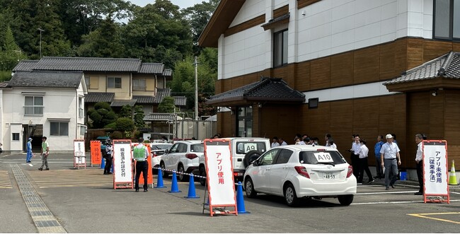 検査場での避難車両 10 台の通過にかかる時間がアプリ方式では約 9 分、従来手法では約 15 分となり、約 4 割の時間短縮を実現しました。また避難所においては、昨年度と同様に、アプリ方式では QR コード読み取りおよびアプリ上での事前の問診回答により待機なく瞬時にチェックインを完了できた一方、従来手法では住民が自治体職員に個別に氏名を伝え、さらに口頭で問診に回答する必要があったため、待機の列ができる結果となりました。