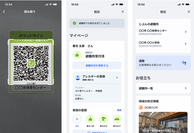 家族登録、アレルギー情報等の登録、プッシュ通知の受信、安否状況の応答・共有、問診票の回答、避難所二次元コード受付、避難所情報の確認など