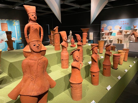 会場では、市原歴史博物館の主要展示資料「山倉1号墳出土埴輪」のほか、重要文化財の「生出塚埴輪窯跡出土人物埴輪」など、古墳時代後期(6世紀後半)の埴輪を多数展示し、房総半島における埴輪文化と地域間交流の実像に迫っています。
