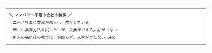 労働人口の減少により、新たな人材の獲得が難しく、また人員増加に伴う固定費の増加も課題とされる経営者が増えています。当サービスでは、Web制作会社の経営者がお持ちの、人手不足による組織体制の課題や集客手法の課題をヒアリングし、コンサルタントが在宅ワーカーを活用した固定費をかけない新しい組織体制をご提案する「マンパワー不足解消診断」を実施しております(無料)。