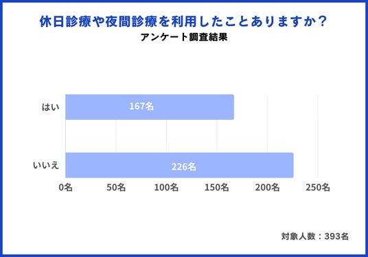 - 休日や夜間の緊急時に診療を受診を受けたことがある人の割合:42.5% (167/393名中)