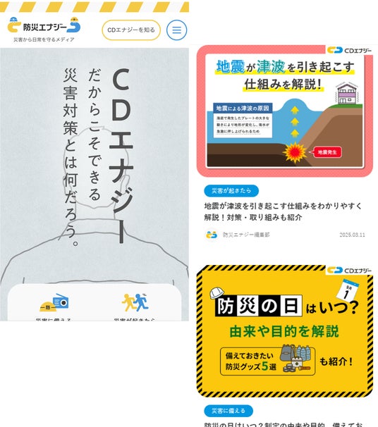 株式会社CDエナジーダイレクト(本社:東京都中央区、代表取締役社長:武村勝博、以下、CDエナジー)は、防災に関する最新情報や実践的な対策を提供するオウンドメディア「防災エナジー」を2025年3月11日(火)にリリースいたしました。