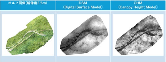 撮影した画像は、DeepForest社の3次元画像合成ソフト「DF BIRD」を使用し、オルソ画像およびDSM(Digital Surface Model)を作成しました。160枚の写真から1時間程度で合成処理が完了しました。また、国土地理院が公開する地面データ(DTM)との差分を計算し、樹木などの高さ情報を示すCHM(Canopy Height Model)を生成しました。