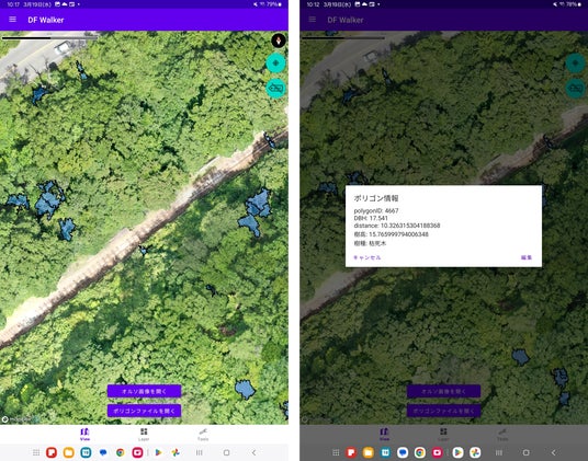 DeepForest社の現地調査用アプリ「DF Walker」に解析した結果をインポートし、枯死木検出箇所の現地確認デモを実施しました。DF Walkerはスマートフォンおよびタブレットに入れて使用するアプリケーションで、GPSと連携して現在地を表示しながら、オルソ画像やDF Scannerの解析結果を確認することが可能です。DF Walkerを使用することで、目標箇所(枯死木検出箇所)への到達が容易になり、また、解析結果と現地の状況が一致していることが確認できました。DF Walkerには、アプリ上でファイルを作成する機能もあるため、解析では検出できなかった場所の記録にも活用できることがわかりました。