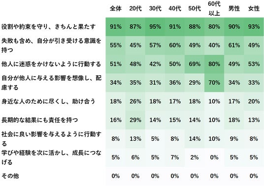全体的に年代・性別による大きな偏りは見られませんでしたが、60代以上では「他人に迷惑をかけないように行動する」(80%)や「他人に与える影響への配慮」(70%)といった“周囲への気遣い”に関する項目の選択率が突出して高く、年齢とともに責任感の視点が「義務」から「配慮・共生」へと変化していく様子がうかがえます。