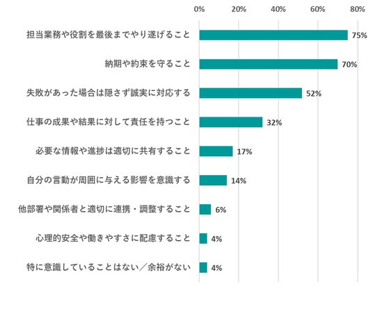 回答の上位には「担当業務や役割を最後までやり遂げること」(75%)、「納期や約束を守ること」(70%)、「失敗があった場合は隠さず誠実に対応する」(52%)が並びました。