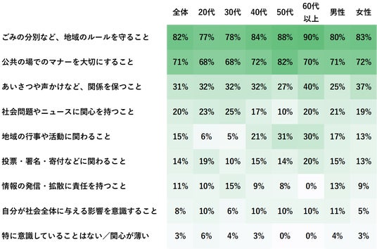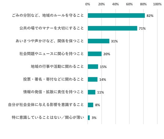 「ごみの分別など、地域のルールを守ること」(82%)、「公共の場でのマナーを大切にすること」(71%)が突出して高く、地域社会における責任感は“秩序の維持”や“迷惑をかけない行動”に集約されていることが分かりました。