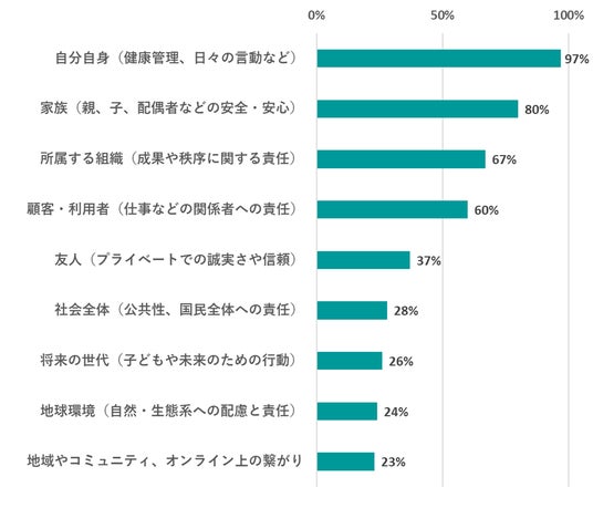 責任の範囲に関する質問では、「自分自身」(97%)をはじめ、「家族」(80%)、「所属する組織」(67%)、「顧客・利用者」(60%)と、比較的身近な範囲への責任感が強く意識されていることが分かりました。