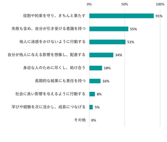 「責任感とは何か?」という問いに対し、最多の91%が「役割や約束を守り、きちんと果たすこと」を選択しました。
