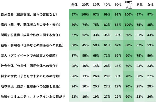 責任の対象も、自分や家族など身近なものから、職場・社会・未来の地球環境へと広がっており、その捉え方は年齢やライフステージによって多様に分かれています。