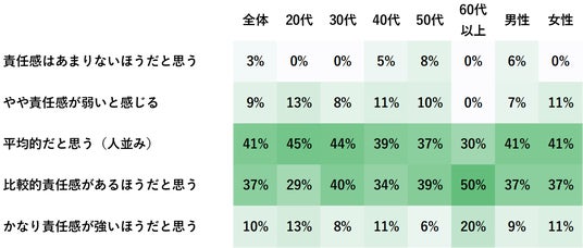 また、「平均的だと思う」は41%を占め、「あまり責任感がない」「やや弱い」と自己評価する人は合計12%と少数にとどまりました。つまり、9割弱が「自分には一定以上の責任感がある」と捉えていることが明らかになり、責任感は自己認識としても肯定的に捉えられている傾向がうかがえます。