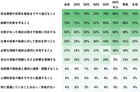 「役割をやり遂げること」と「納期を守ること」は、全年代・性別で高い数値を示しており、最も共通意識としての責任感が見られる項目です。