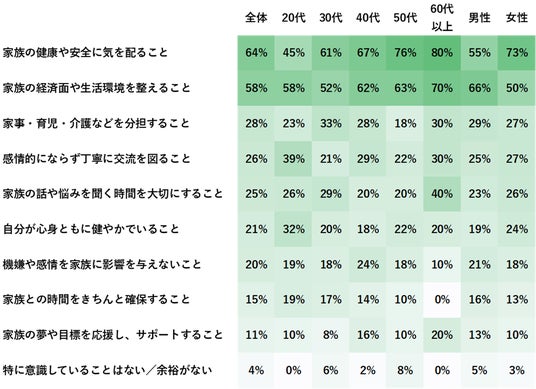 男女ともに全体的な傾向に大きな差は見られませんでしたが、「家族の健康への配慮」は女性よりも男性(特に50代~60代)で高く、「生活環境を整えること」や「育児・介護などの担い手意識」は男女で比較的均等でした。