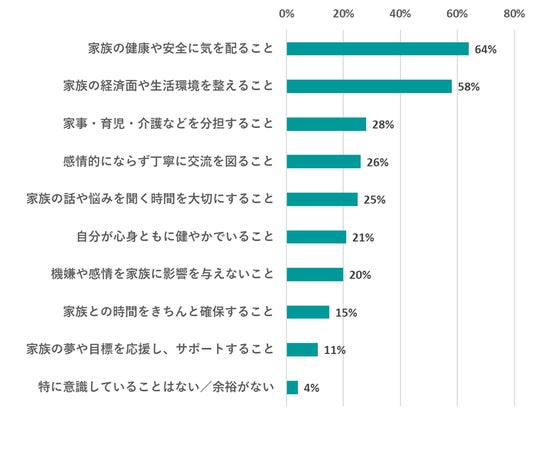 最も多かったのは「家族の健康や安全に気を配ること」(64%)、次いで「生活面・経済面を整えること」(58%)という結果になりました。
