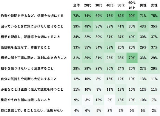 - 友人・仲間には「約束や時間を守ること」(73%)が最重視された