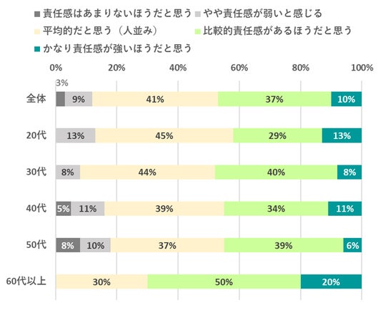 年代・性別による大きな傾向差は見られませんでしたが、60代以上では「かなり責任感が強いと思う」が20%と最も高く、年齢とともに自己評価が上昇する傾向も見られました。