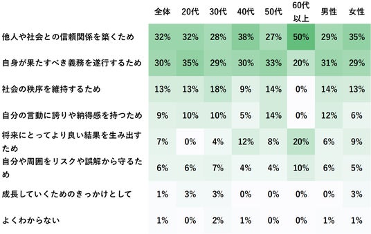 年代・性別による傾向差は大きくは見られないものの、60代以上では「信頼関係の構築」が50%と突出して高く、一方で30代以下では「義務の遂行」が上回る傾向にありました。