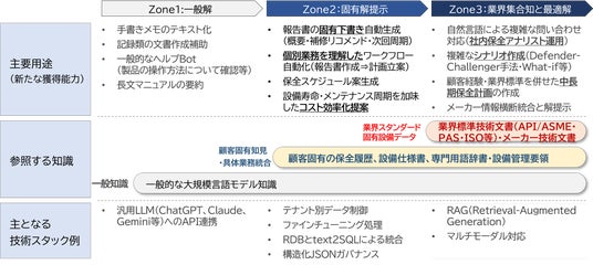 EMLink Intelligenceは、単純な文書作成代替・要約補助などの一般的なLLMの利用にとどまらず、知識深度の個社特化×業務のワークフローを統合する機能の実現を目指しています。(当社ではZone2相当と呼んでいます)