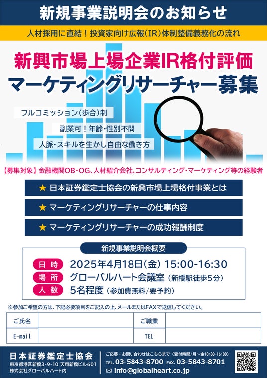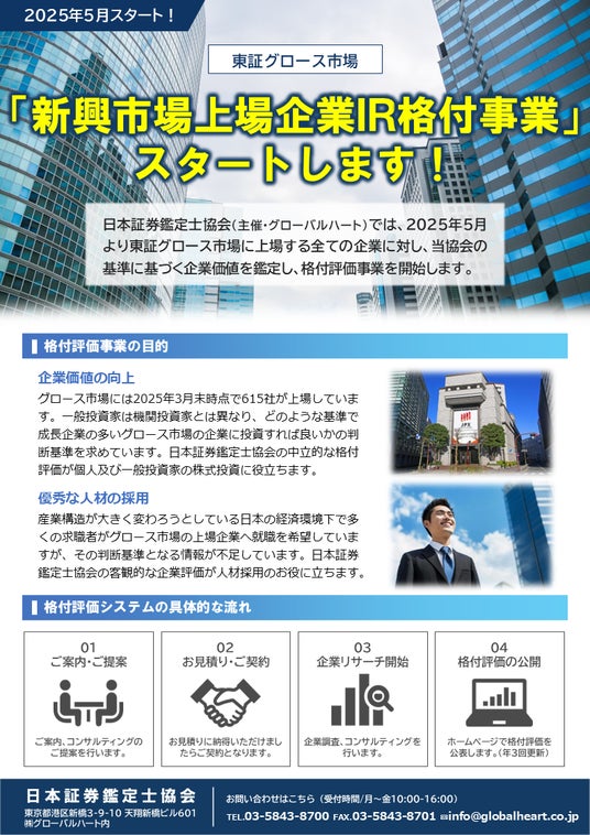 日本証券鑑定士協会(主催・グローバルハート)では、2025年5月より東証グロース市場に上場する全ての企業に対し、当協会の基準に基づく企業価値を鑑定し、格付評価事業を開始します。