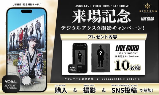 株式会社Digittle(本社:東京都渋谷区、代表取締役:韮澤 真人、以下当社)は、株式会社LDH JAPAN(本社:東京都目黒区、代表取締役社長:五十嵐広行 以下、LDH)の所属アーティスト 三代目 J SOUL BROTHERSが3月29日から開催するライブツアー「三代目 J SOUL BROTHERS LIVE TOUR 2025 "KINGDOM”」にて、ライブ参加記念のデジタルグッズ「LIVE CARD」を販売します。