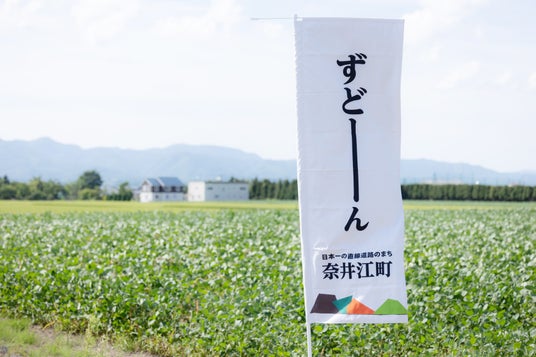 「ずどーん」は、日本一の直線道路のまち奈井江町に由来しながら、広がる田園風景、雄大な山並み、大らかな奈井江町の気質、この町が有する有形無形のさまざまな資源が共鳴するパワーを表現しています。前ページでご紹介したように、さまざまな使い方が町内外に広がっています。単に役場の職員の名刺や封筒の肩におさまったりするだけのものではなく、町民や事業所、団体それぞれのアイデア次第で、さまざまな場面で使っていくことでコミュニケーションが生まれ、奈井江町が他のまちとは違う独自の見え方になっていくことを目指しています。