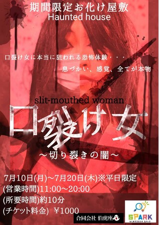 関西を拠点に全国各地の商業施設などでお化け屋敷、ホラーイベントのプロデュースを手掛ける『本社:大阪府淀川区、関西ホラーエンターテイメント集団 合同会社伯虎座』(以下 合同会社伯虎座)は、2023年7月10日(月)~7月20日(木)の平日限定で、大阪天保山マーケットプレース2F『ひらめきスタジオ SPARK』にて期間限定お化け屋敷『口裂け女~切り裂きの闇~』を期間限定開催する。