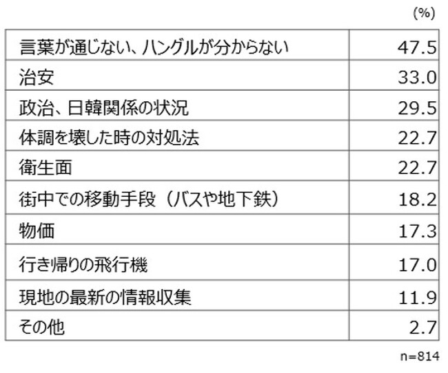 韓国旅行をする上で心配な事としては、「言葉が通じない、ハングルが分からない」が47.5%と最も多く、「街中での移動手段」にも18.2%の回答が集まり、言語や交通に関する不安なイメージがあることが分かりました(図4)。一方で、過去に観光目的で韓国旅行の経験がある方から思いがけず良かったことを聞いたところ、街のサイズが散策しやすかった、日本語が通じた、など実際には観光しやすかった旨の声があがり、このイメージの乖離は、今後、男性送客拡大に向けて解消していくべき課題といえます。