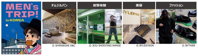 男性も楽しめるコンテンツを多数紹介した新しい広報資料「MEN’s TRIP! In KOREA」。定番のグルメやショッピング以外にも、日本でも人気の高いサウナの韓国スタイルを体験できるチムジルバンや、エキサイティングな射撃体験など男性に人気のコンテンツから、男性の間でも関心が高まってきているビューティー体験や、トレンドファッションまで多種多様な需要に応える素材を紹介します。