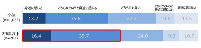 調査対象1033名に、韓国や韓国文化についてどれだけ身近に感じるかを尋ねたところ、「身近に感じる」および「どちらかといえば身近に感じる」と回答した割合が計48.8%となりました。 「身近に感じる」と回答した割合は29歳以下が最も高く「どちらかというと身近に感じる」と合わせて56.1%に及び、全体に比べると若い世代により韓国カルチャーが身近であることが明らかになりました(図5)。