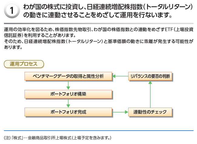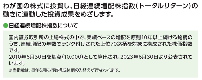 わが国の株式に投資し、日経連続増配株指数(トータルリターン)の動きに連動した投資成果をめざします。