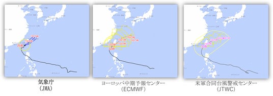 図1 : 「HalexForesight!」で表示した各機関の台風予測情報。