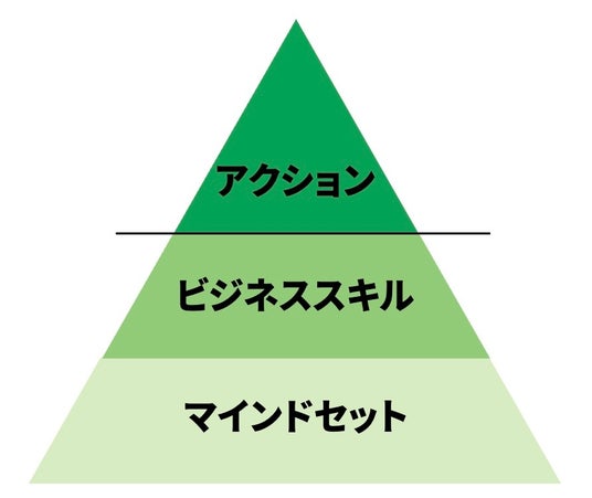 カリキュラムは「マインドセット」「ビジネススキル」「アクション」の3本柱で提供していきます。