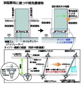 T&TIIIビルは新宿地区の狭隘敷地に建つ、商業兼事務所ビルの建て替え計画でした。地域活性化のリーディングプロジェクトとして、地域を見守り災害に備える、優れた免震建物が求められ、高地価で狭隘な敷地を最大限活用するため、Exp.j等のスペースを省くために中間免震構造を採用し、免震層のクリアランスを小さく抑えています。また、想定外地震時の敷地越境への対策として、免震層の想定外変位を抑制する機構(タイバー機構)を開発し、免震構造の採用において不利な条件に向き合った、都市部ならではの「都市型中間免震建物」を実現したことを評価いただき日本免震構造協会賞の作品賞に選出いただきました。