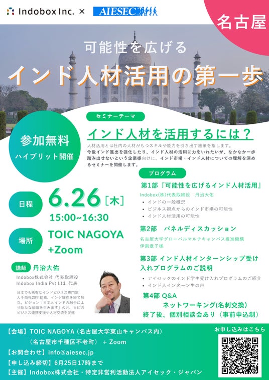 日本企業のインド進出サポート・インド人材の日本展開を行うIndobox株式会社(本社:愛知県名古屋市、以下Indobox)と、日本企業へ海外学生インターンシップ受入れ支援を行う特定非営利活動法人アイセック・ジャパン(以下アイセック・ジャパン)は「日印研修生交換事業」で連携し、2月の東京に続いて、名古屋と大阪で共同セミナーを開催致します。次世代のグローバルリーダー育成と日本企業のインド理解・インド人材活用を促進します。