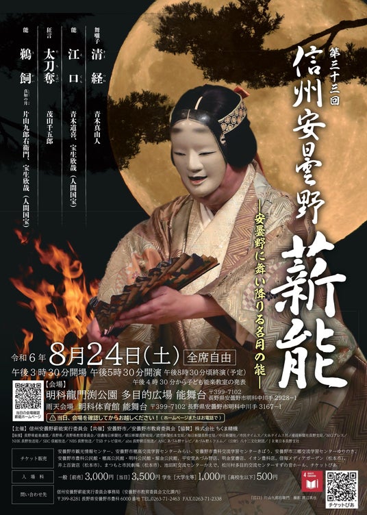 - 開催概要■日時 令和6年8月24日(土) 午後5時30分開演(午後3時30分開場)■場所 明科龍門渕公園(安曇野市明科中川手2928-1) ※雨天時:明科体育館(安曇野市明科中川手3167-1)■演目・出演者(1)舞囃子「清経」 青木真由人(2)能「江口」 青木道喜、宝生欣哉(人間国宝)(3)狂言「太刀奪」 茂山千五郎(4)能「鵜飼 真如之月」 片山九郎右衛門、宝生欣哉(人間国宝)※午後4時30分から子ども能楽教室の発表を行います。