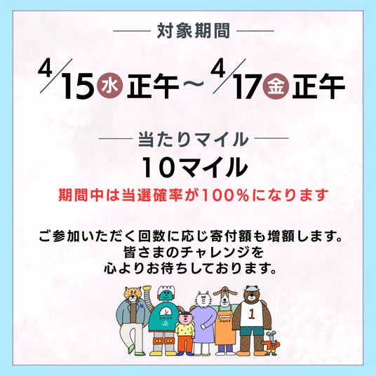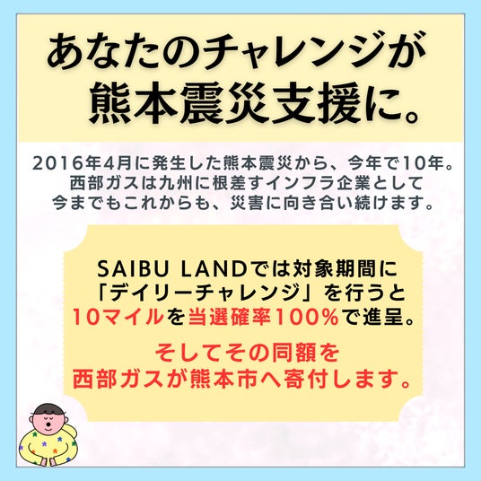 対象期間中、SAIBU LANDの「デイリーチャレンジ(毎日チャレンジ!ドアの向こうは?)」に参加したお客さまには、1回のチャレンジにつきもれなく10マイルを必ず進呈し、その同額を熊本城災害復旧支援金として熊本市へ寄付します。