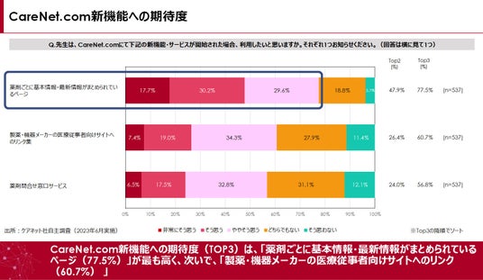 実際に、「DI Plus(R)」の開発時に実施したケアネットの独自調査では、77.5%の医師が「薬剤ごとに基本情報や最新情報がまとめられているWebページを利用したい」と回答しており、医薬品情報を網羅的かつ効率的に収集できるプラットフォームへの高いニーズが明らかになっています。