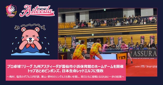 Tリーグ所属プロ卓球チーム「九州アスティーダ」を運営する「九州アスティーダ株式会社」(所在地:福岡県大野城市、代表取締役 川面 創 以下、当チームおよび、当社)は、2025年1月11日および1月12日に雲仙市小浜体育館にて開催されたホームマッチにて、トップおとめピンポンズ名古屋、日本生命レッドエルフに それぞれ 1 - 3 にて敗北したことをお知らせします。