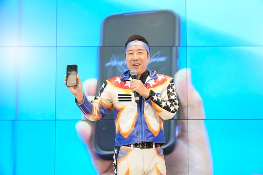 さらに、AI自動背景機能に関する詳細説明を受けて、MCガッツさんは「背景が素晴らしいですよね。自分が考えたアイディアや断片的なリクエストにも応えてくれるんですよ。実際に僕も作ってみたのですが、ミニ四駆の写真を撮って、音楽が好きなのでロックっぽい背景にしたいなと思って、カタカナで『ロック』と入力したら、南京錠の画像が出てきたんです(笑)。ところが、意外とこの鎖に繋がれた南京錠とミニ四駆がロックしているなと思って!」とMCガッツさんが自ら撮影した作品を来場者に披露しました。