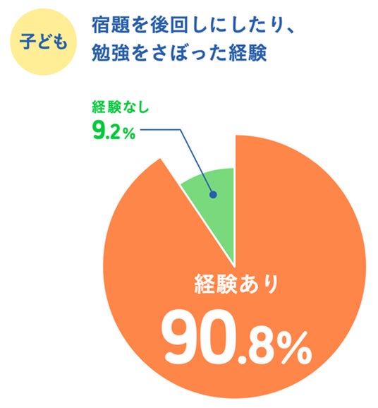 そもそも子どもはサボって当たり前です。なぜなら未成熟な年頃の上、家庭には「テレビ・ゲーム・漫画」など、多くの誘惑が存在するからです。今回のアンケートでも、小学生の9割は「宿題を後回しにしたりサボったりした経験がある」と答えています。